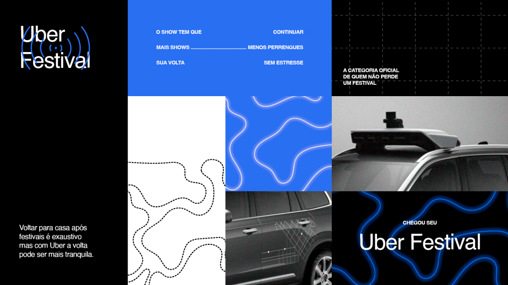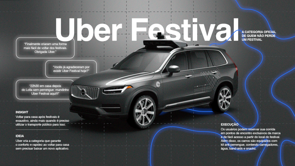 Criamos uma nova categoria da Uber para quem só quer voltar pra casa sem perrengue. Pontos de encontro exclusivos e kits de sobrevivência nos carros garantiram o conforto pós-festival sem precisar baixar mais nada.